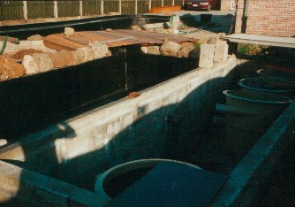 De skimmer is ingemetst;de polyester aangebracht en de rotsen geplaatst.